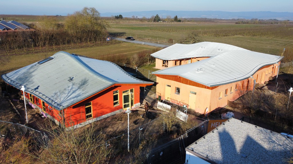 Hier enstand eine eingeschossige Kindertagesstätte mit einem gewölbten Satteldach.