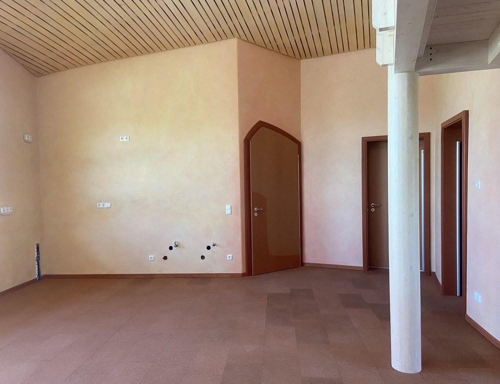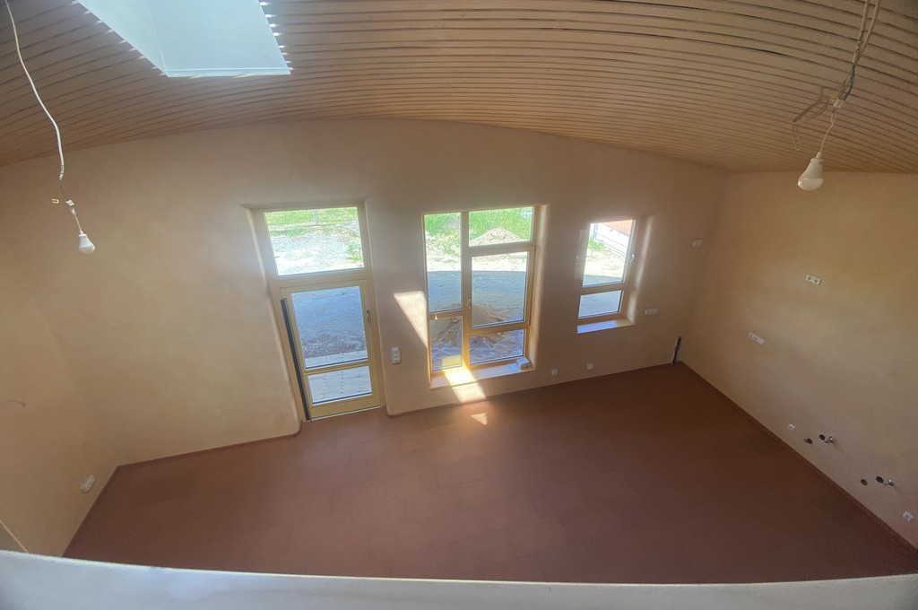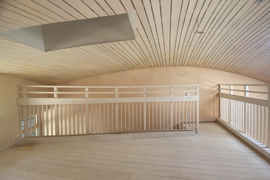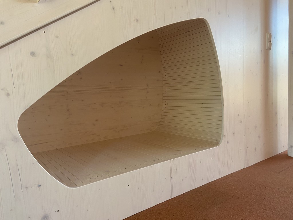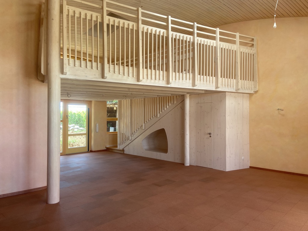 Die Holzständerwände unterteilen den großen Raum in mehrere kleine Räume. Der große Gruppenraum bekommt durch die Empore einen besonderen Charme und sorgt für eine weitere Spielebene, während die kleine Spielnische unter der Empore als Rückzugsort für die Kinder fungiert.