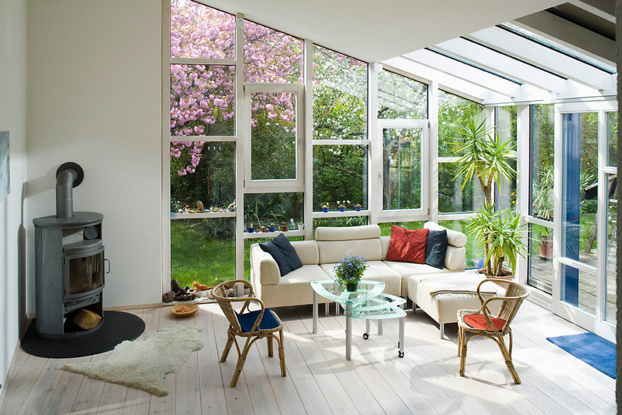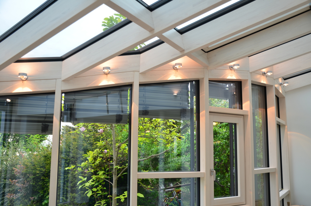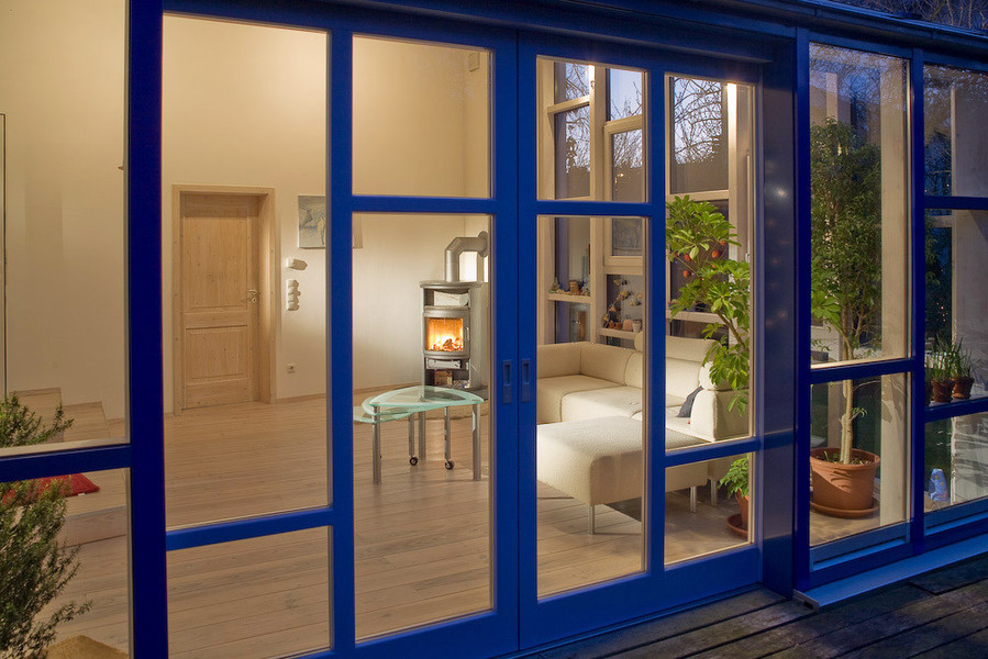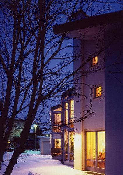 Durch Maßnahmen an der Außenwand und an den Fenstern kombiniert mit einer effektiven Lüftungsanlage und der Erneuerung der Heizungsanlage mit Solarmodulen und Pufferspeicher wurde das 45 Jahre alte Gebäude an die heutigen Wohnbedürfnisse und Energiestandards angepasst. Die Dachflächen waren bereits im Bestand gedämmt. Der konventionelle Baukörper wurde durch organisch geformte Glasanbauten an der Hauseingangsseite und am rückwärtigen Bereich durch einen großzügigen Wintergarten ergänzt. Dadurch wurde ein Kontrast zwischen der klaren Gebäudestruktur des Bestandes und der offenen Form des Anbaus geschaffen. Der Wintergarten ist mit 3-fachem Isolierglas versehen. Das Glas des Daches ist dimmbar und die Fassade wurde mit einem sommerlichen Wärmeschutz ausgestattet. Der Wintergarten geht in den Wohn-Essbereich über und gibt den Blick in den Garten frei. Im Innenraum dominiert ein weißer Kalkputz an den Wänden und Decken, bzw. weiß geöltes Stäbchenparkett aus Eiche am Boden. An der Außenfassade wurde Mineralfaserdämmung und ein mineralischer Putz aufgebracht.