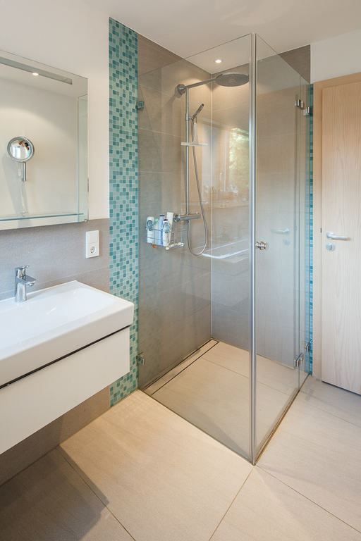 Im Obergeschoss wurde ein modernes Bad realisiert. Die energetische Sanierung nach KfW-85-Standard umfasst innovative Fenster, mineralische Dämmung, Fußbodenheizung, Solarthermie und Lüftung mit Wärmerückgewinnung.
